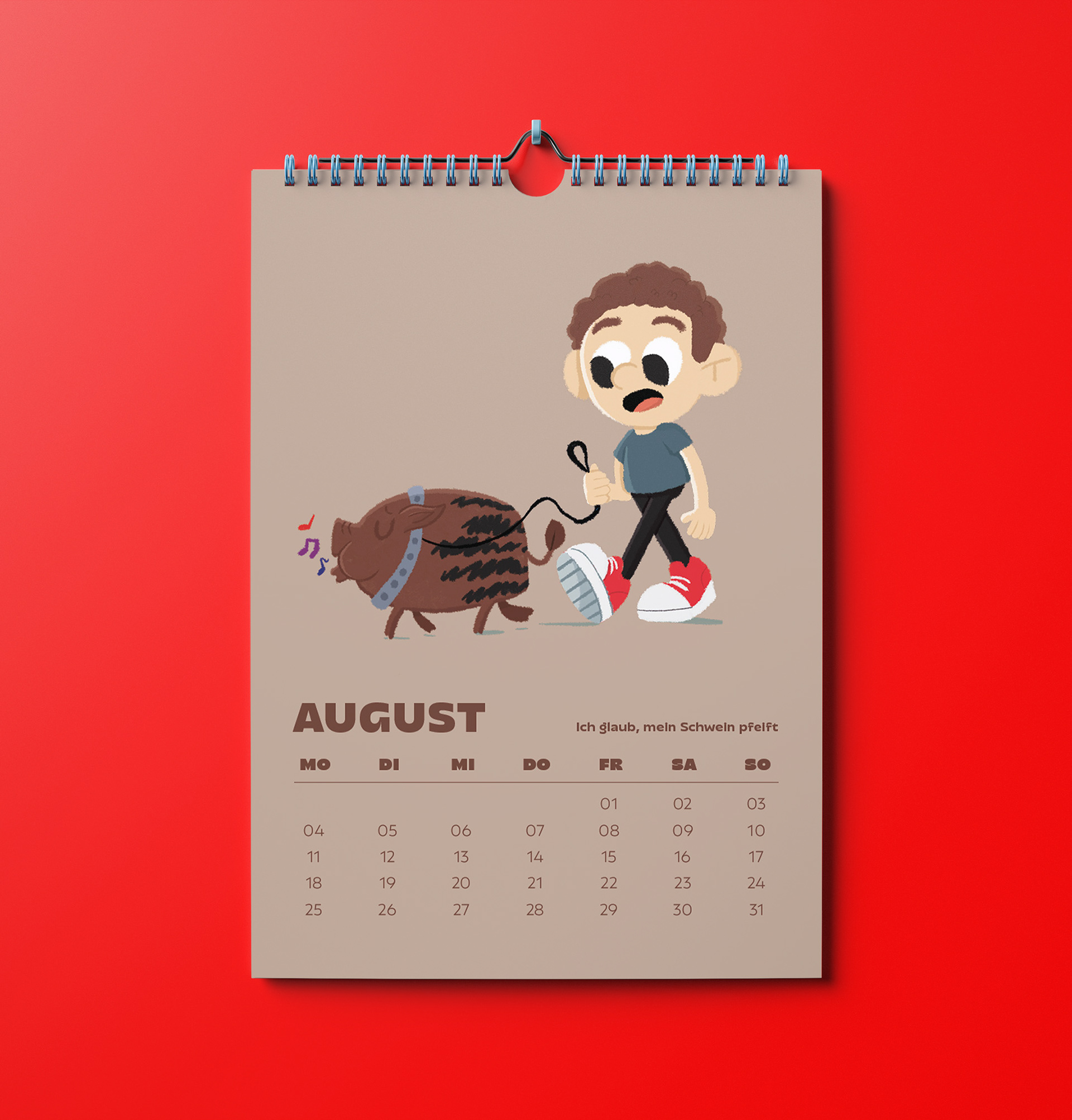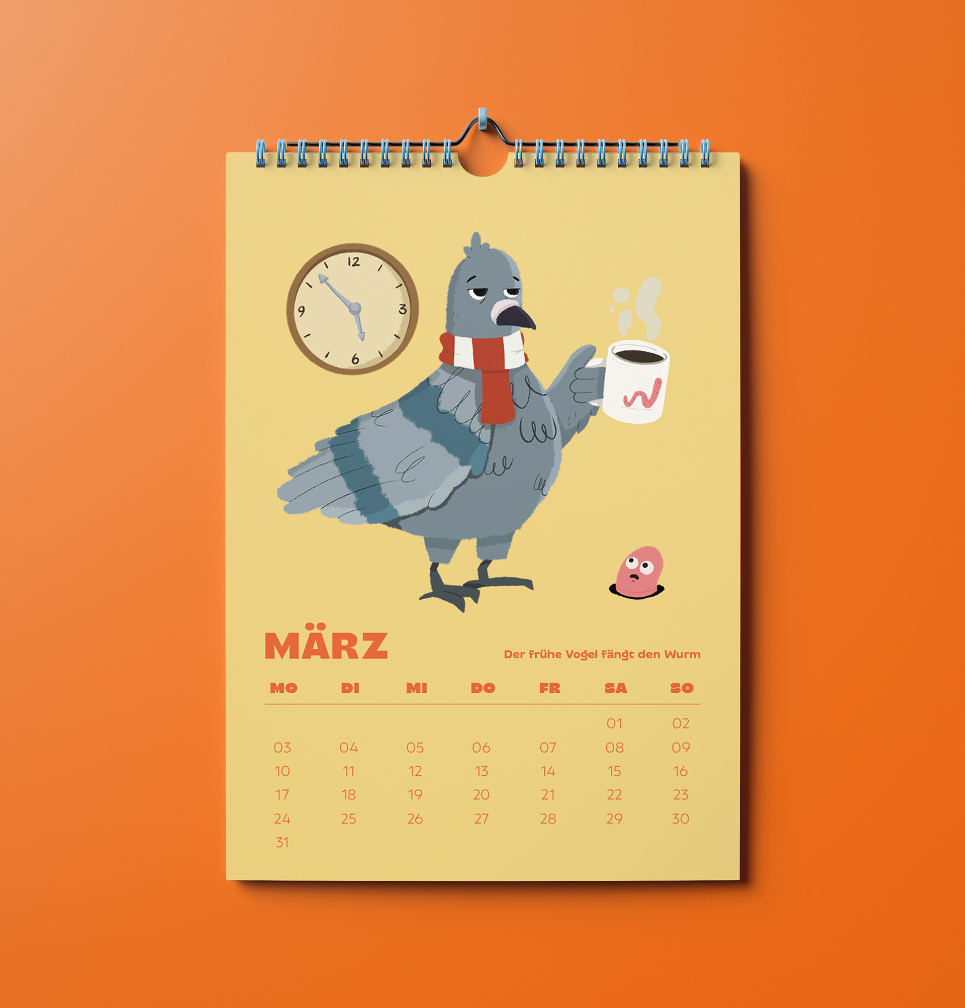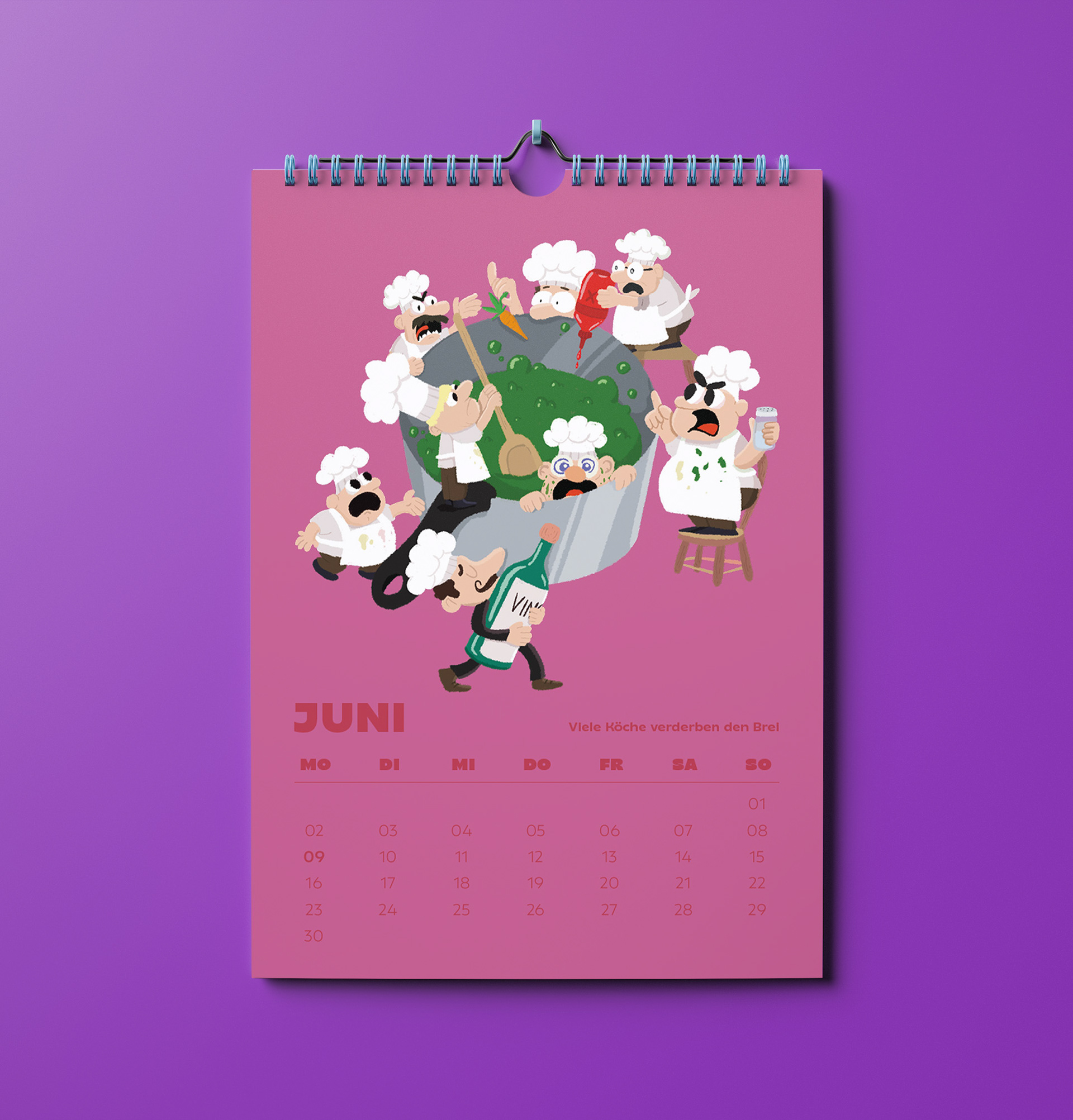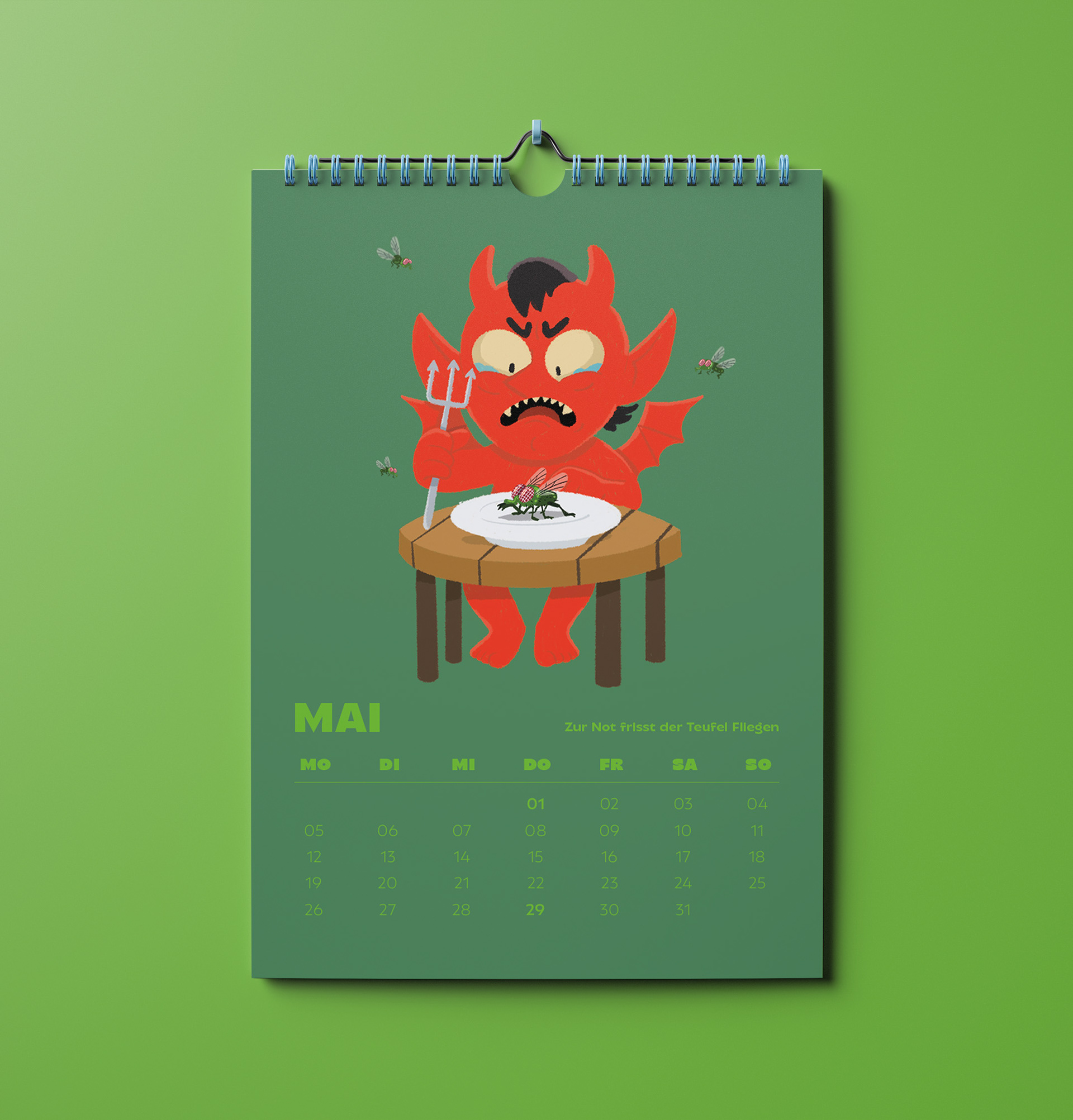 Each month shows a familiar german saying illustrated in a playful, literal way. From a devil dining on flies to the surprise of a whistling pig, these illustrations bring the humor and charm of everyday phrases to life.
